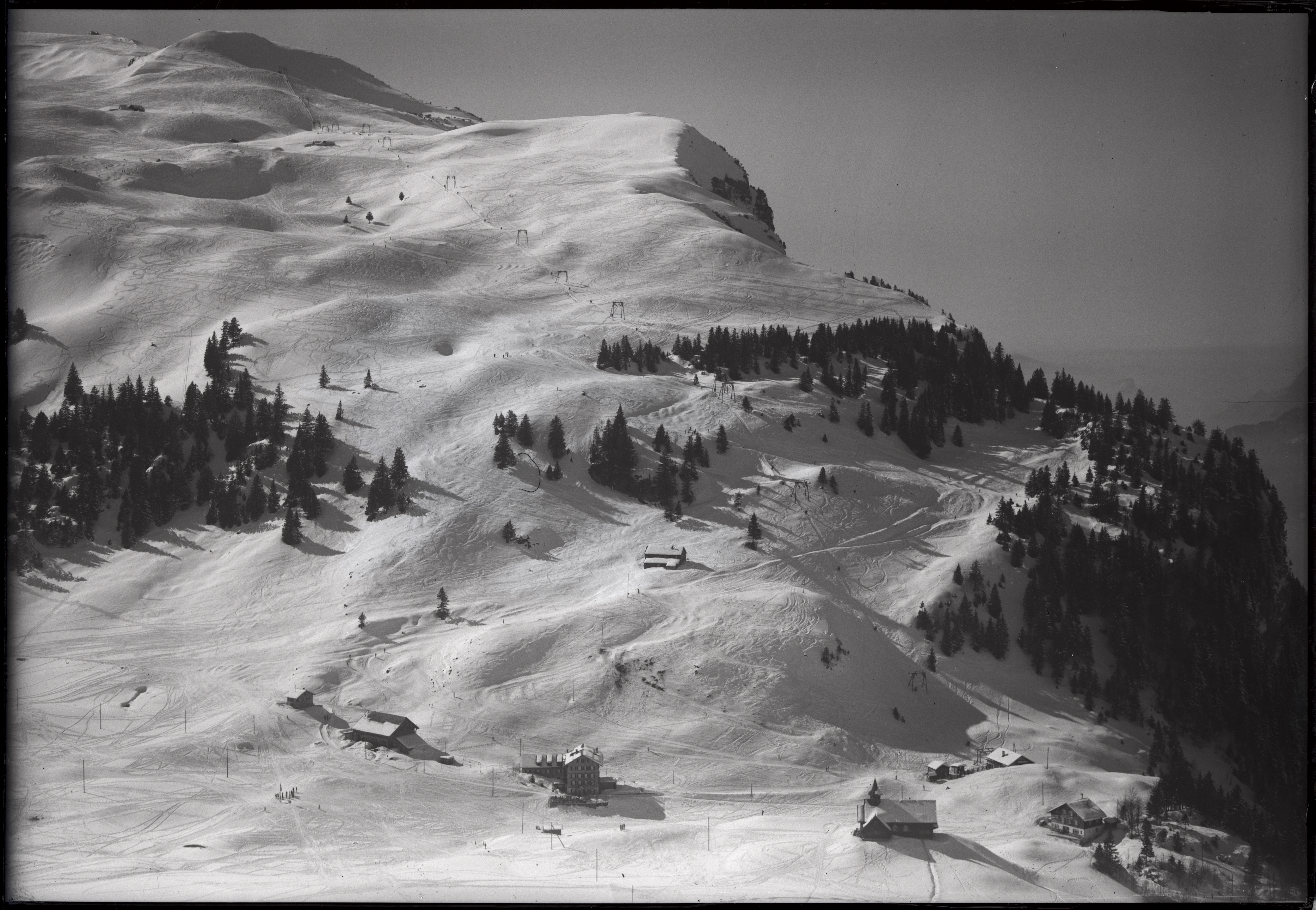 Téléski vers le Fronalpstock dans la station de Stoos, 1946 © ETH-Bibliothek Zürich, Bildarchiv, Stiftung Luftbild Schweiz, Photographe Werner Friedli