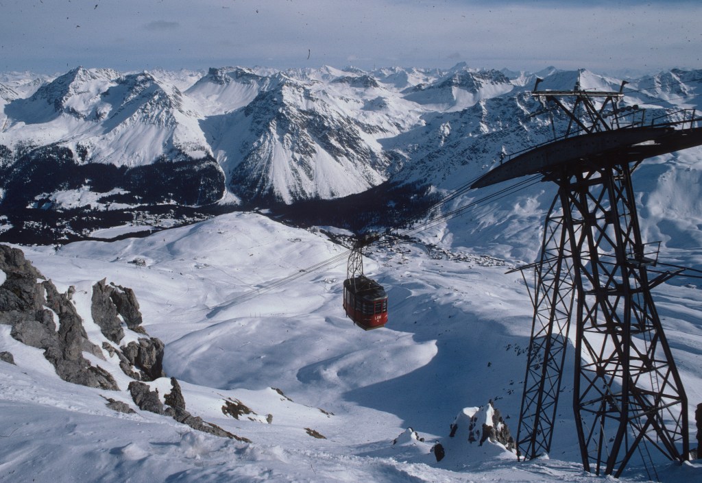 Dans les années 50, ces projets ne permettent ainsi pas seulement d’atteindre des altitudes plus élevées, ils offrent aussi des cabines de plus en plus grandes, prélude à une massification encore évanescente. Le téléphérique à va-et-vient le plus performant de l’époque est inauguré en 1957 à Arosa. C’est l’entreprise Von Roll, basée dans le canton de Soleure, qui le construit entre la gare ferroviaire de la station grisonne et le sommet du Weisshorn, avec des cabines de plus 50 places et une vitesse de 6 et 10 mètres par seconde pour les deux sections de l’infrastructure. Deux ans plus tôt, en 1955, en Engadine, le téléphérique vers le Piz Nair est inauguré, avec là aussi deux cabines de 40 places offertes aux skieurs et un temps de parcours de huit minutes entre 2’486 mètres et 3056 mètres. Plus haute installation d’Europe à son inauguration, ce téléphérique a été construit par l’entreprise Habegger basée à Thoune (dans le canton de Berne). A chaque fois, ce sont des prouesses technologiques.