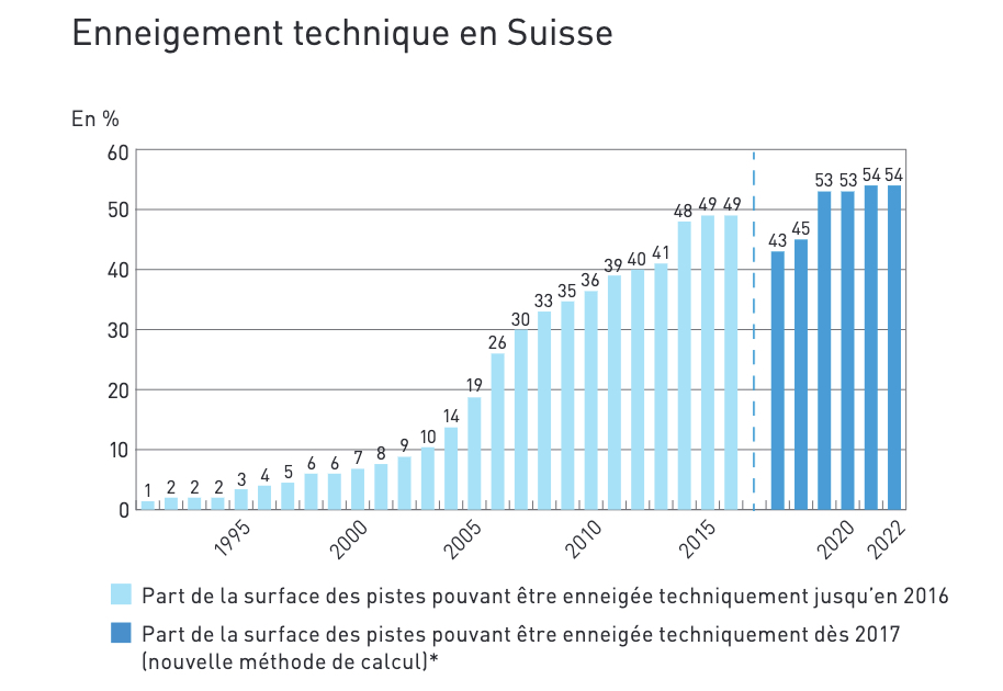 En Suisse, jusqu’au début des années 2000, la part de la surface des pistes pouvant être enneigée artificiellement est resté inférieure à 10%, jusqu’à un boom entre les hivers 2005, 2006 et 2007, et un passage à plus de 30% de surface des pistes pouvant être enneigée artificiellement. Au début des années 2020, ce pourcentage est légèrement supérieur à 50%.